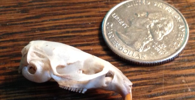 Something just off the trail caught my attention, and I squatted down to get a closer look. Partly covered by grass and debris was a small skull, about the size of a quarter. Likely shrew or mole or mouse. A couple of people ran down the cross trail about fifty feet away without seeing me.