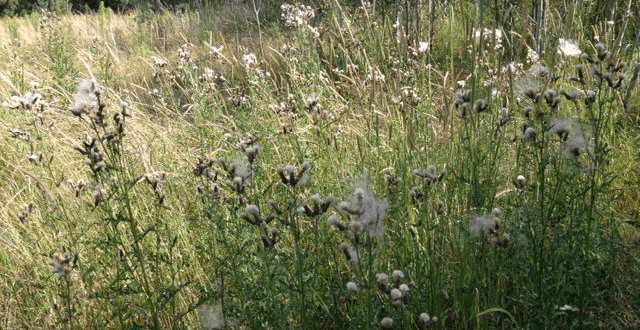 Where the creek exits the foothills, the trail goes through a massive tangle of vegetation. It was once used for storage and research, but the buildings are long gone and even where they were, trees and shrubs and vines have begun to reclaim the site. Open grassy areas are surrounded by old, broken trees grown into weird shapes, and dead limbs and lesser vegetation litter the ground.
