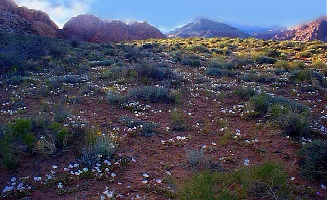 Eventually, spring came and with it, warmer weather, bluer skies and a lot more sunshine. Then the silver lining was revealed: Due to all the rain and flooding — it seemed as if every single plant in the desert had been just waiting for enough moisture to bloom. And bloom they did! The reservation desert was carpeted with flowers of every color in every direction. Some days, I felt like Dorothy in the Wizard of Oz, overwhelmed by the exotic scents, becoming lightheaded as I drove through the blooming fields. The colors were incredible and the intoxicating perfume and stunning colors put the past winter soundly away.