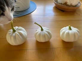We’ve got a few volunteer vines growing on the compost pile. There’s one fruit that seems to be a butternut squash, so maybe it will ripen before it gets too cold. Another vine produced some small white pumpkin-like fruits. The vines have already died, so I’ve already harvested them – ornamentals, I suspect.