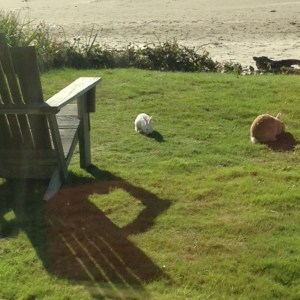 With Barry gone and the kids involved with school and their new friends, Ginny is occasionally lonely. But sitting out here on Esme’s porch helps. Usually, she is entertained by the feral bunnies that play and romp across the yard. Some are pretty big, but they all retain the various colors of their domestic rabbit ancestors: black, white, yellow, brown and various combinations.